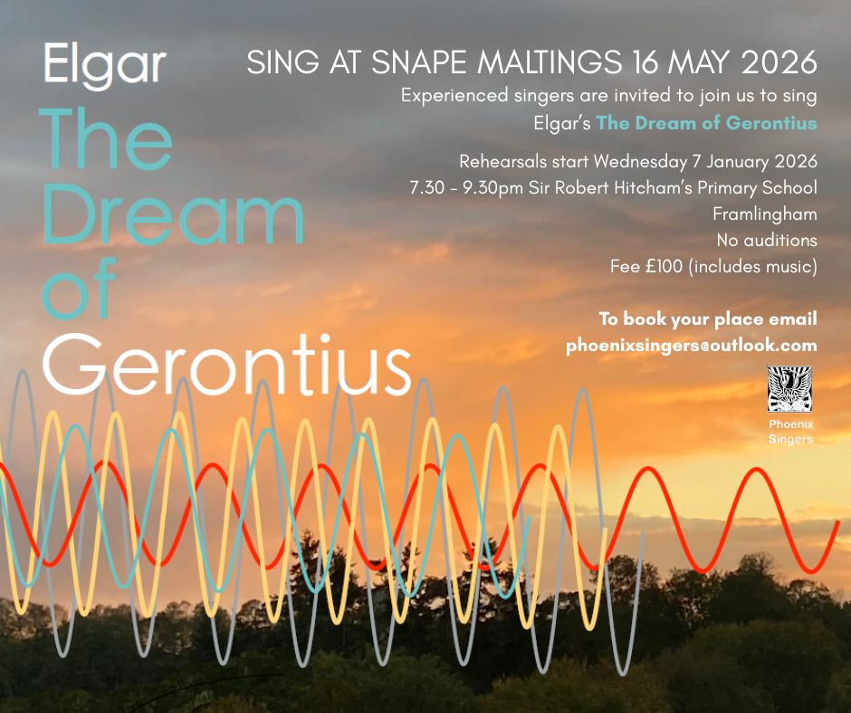 Experienced singers are invited to join Phoenix Singers to perform Elgar’s The Dream of Gerontius at Snape Maltings on 16th May 2026. Rehearsals begin 7th January in Framlingham. No auditions. Email phoenixsingers@outlook.com to book or for more information. Rehearsals begin 7th January 2026.
